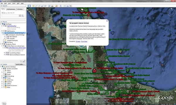 In 2011, a student mapped the Native schools of the 19th and 20th centuries, and the Kura Kaupapa of the 20th and 21st centuries, in the Waikato and Bay of Plenty area. At each placemark, she incorporated narratives from the school. This illustrates the massive shift in the education of Māori children that has occurred since the introduction of Māori immersion schools.