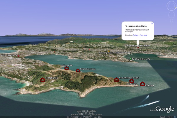 In 2009, one student geo-referenced Google Earth to a 1917 map of Te Whanganui a Tara (Wellington Harbour), then used Elsdon Best's "The Land of Tara" to map old Māori placenames, pā sites, and resources.